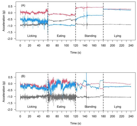 Raw values of the tri-axial accelerometer signals fitted on the neck-collar (A) and ear-tag (B) for licking, eating, standing, and lying behaviours at 25 Hz sampling rate over 60 s of observation. The grey, red, and blue lines represent X-, Y-, and Z- axes, respectively.