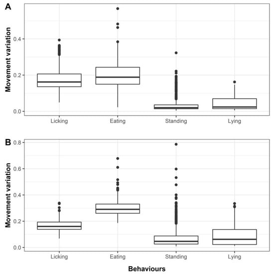 According to the mean Gini values, MVA and SDx were the first and second most important features for distinguishing licking from other observed behaviours across the three ethograms within both neck-collar and ear-tag deployment modes except for ethogram 3 of the neck-collar deployment (Table 3). The distribution of MVA of the four mutually exclusive behaviours for neck-collar and ear-tag accelerometers is displayed in Figure 3. The mean (±SD) of neck-collar and ear-tag MVA for eating behaviour was the highest among the four mutually-exclusive behaviours (0.20 (±0.07) and 0.30 (±0.05), respectively). Mean (±SD) MVA for licking was 0.18 (±0.06) and 0.17 (±0.04), lying 0.04 (±0.03) and 0.09 (±0.07), and standing 0.03 (±0.04) and 0.07 (±0.08) for the neck-collar and ear-tag, respectively. This sequential trend was consistent across both neck-collar and ear-tag accelerometer deployment modes (Figure 4A,B).