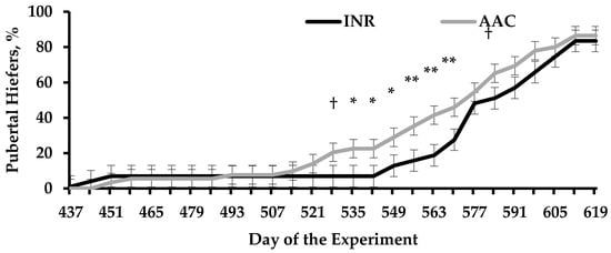 Puberty attainment of replacement heifers from beef cows that received diets containing supplemental sulfate sources of Co, Cu, Mn, and Zn (INR) or organic-complexed source of Co, Cu, Mn, and Zn (AAC) during gestation. Adapted from Harvey et al. []. Heifers were weaned on d 367 of the experiment, at ~7 mo of age. A treatment × day interaction was detected (p < 0.01). Within days: † 0.05 ≤ p ≤ 0.10; * p ≤ 0.05; ** p < 0.01.