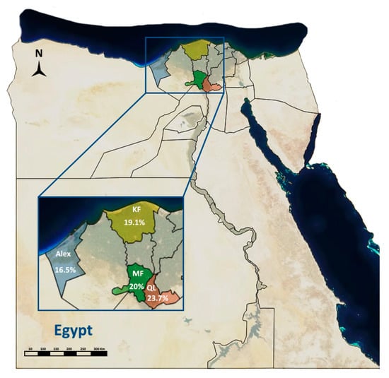 The study area of the serosurvey comprised Kafr ElSheikh, Alexandria, Menofia, and Gharbia Governorates. Geographically, these areas are located between 30.12861 to 31.2057531° N latitude and 29.924526 to 31.242222° E longitude. Additionally, these Governorates have a Mediterranean climate: cool, humid, and with rainfall during winter and warm and dry during summer. These areas are characterized by various agro-climates, which are suitable for different kinds of crop production and the raising of sheep and goats.