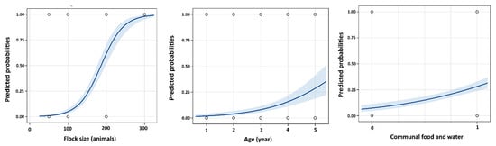 Probability plot for the ability of flock size, age, and communal feeding and watering categories to predict the prevalence of contagious caprine pleuropneumonia (CCPP) in the Nile Delta sheep and goats in Egypt. The curve shows the likely probability of positive CCPP associated with each large category of flock size, age, and communal feeding and watering with the 95% confidence interval shaded blue.