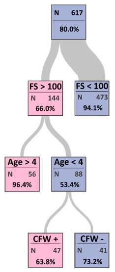 Estimated classification tree determining the most important risk factors of contagious caprine pleuropneumonia (CCPP) in sheep and goats. This tree started with node 0 representing all observations. The color of the square in each leaf node indicates the most frequent level of CCPP among the observations in that node, and this is also the classification level assigned to all observations in that node. The color of the node indicates seronegativity (purple) and seropositivity (pink) for CCPP. Each node has a proportion of observations that have the most frequent level in that node. The width of the link between parent and child nodes is proportional to the number of observations in the child node. The classification tree analysis indicated that flock size (FS), age, and communal food and water (CFW) are the most important risk factors of CCPP.