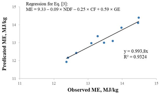 | 3 | ME = 9.33 − 0.09 × NDF − 0.25 × CF + 0.59 × GE | 0.93 | −23.94 | 0.26 | <0.001 |