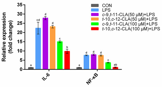 Gene expression of proinflammatory cytokines in ruminal epithelial cells (RECs) upon lipopolysaccharide (LPS) stimulation with pretreatment with 50 or 100 μM of different conjugated linoleic acid (CLA) isomers. The cells were treated without (CON) or with 0.1 μg/mL LPS for 3 h after pretreatment with 50 or 100 μM cis-9,trans-11-CLA (c-9,t-11-CLA+LPS) or trans-10,cis-12-CLA (t-10,c-12-CLA+LPS) for 24 h or not (LPS). a–d Bars that share different superscript letters are significantly different from each other (p < 0.05).