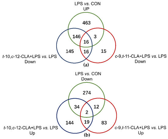Venn diagrams of the known differentially expressed genes (DEGs) according to the comparisons of different treatments. (a) The DEGs that were downregulated by the pretreatment of either cis-9,trans-11-conjugated linoleic acid (CLA) or trans-10,cis-12-CLA and upregulated during LPS stimulation. (b) The DEGs that were upregulated by the pretreatment of either cis-9,trans-11-CLA or trans-10,cis-12-CLA and downregulated during lipopolysaccharide (LPS) stimulation. The cutoff values of the differential expression criteria were fold change (FC) > 1.5 and padj < 0.05.