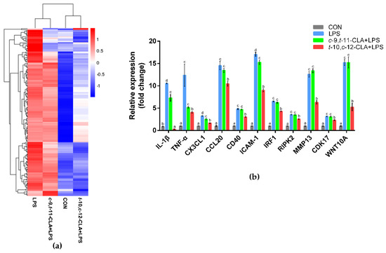 Effect of pretreatment with different conjugated linoleic acid (CLA) isomers on preventing inflammatory responses in lipopolysaccharide (LPS) −stimulated ruminal epithelial cells (RECs). (a) Hierarchical clustering analysis of the overlapping differentially expressed genes (DEGs) that were downregulated by CLA isomer pretreatment and upregulated during LPS stimulation. The color code represents genes expressed at low (blue) and high (red) levels. (b) Gene expression levels of inflammation−related factors among the different groups. a−d Bars that share different superscript letters are significantly different from each other (p < 0.05).