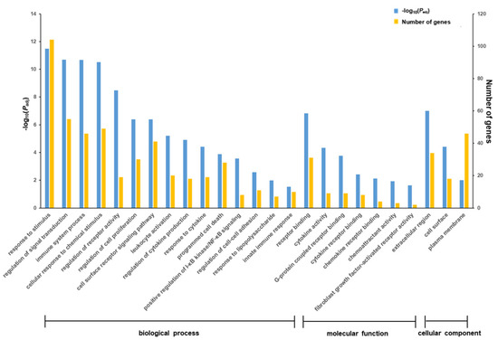 Effect of trans-10,cis-12-conjugated linoleic acid (CLA) pretreatment on the gene ontology (GO) terms in ruminal epithelial cells (RECs) upon lipopolysaccharide (LPS) stimulation. The differentially expressed genes (DEGs) used for functional annotation were significantly downregulated in the t-10,c-12-CLA+LPS group and upregulated in the LPS group.