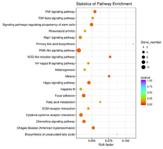 Effect of trans-10,cis-12-conjugated linoleic acid (CLA) pretreatment on the Kyoto Encyclopedia of Genes and Genomes (KEGG) pathways in ruminal epithelial cells (RECs) upon lipopolysaccharide (LPS) stimulation. The differentially expressed genes (DEGs) used for functional annotation were significantly downregulated in the t-10,c-12-CLA+LPS group and upregulated in the LPS group. The circle size indicates the number of enriched genes, and the circle color indicates the padj value.