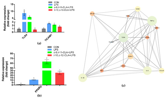 TLR4 is the most well-known receptor of LPS on epithelial cells. Stimulation of RECs with LPS significantly increased the gene expression level of TLR4, but pretreatment with 100 μM t-10,c-12-CLA significantly reversed this effect (p < 0.05) (Figure 6a). The gene expression of TICAM1, which is a Toll-like receptor adaptor molecule, was also significantly reduced by pretreatment with 100 μM t-10,c-12-CLA upon LPS stimulation (p < 0.05) (Figure 6a). However, pretreatment with 100 μM c-9,t-11-CLA yielded no significant effects on the expression of TLR4 and TICAM1 in RECs, which was consistent with its minor anti-inflammatory effects on RECs. The expression of PPARγ, which is involved in suppressing inflammatory responses, was significantly increased by pretreatment with either c-9,t-11-CLA or t-10,c-12-CLA compared with the LPS group (p < 0.05) (Figure 6b). PPI analysis of the DEGs among the t-10,c-12-CLA+LPS and LPS groups further indicated that TLR4, PPARγ, IL-6, TNF-α, IL-1β, CD40, ICAM-1, NF-κB, IRF1, CCL20 and CX3CL1 were identified as hub genes (degree > 5) and showed close interactions (Figure 6c).