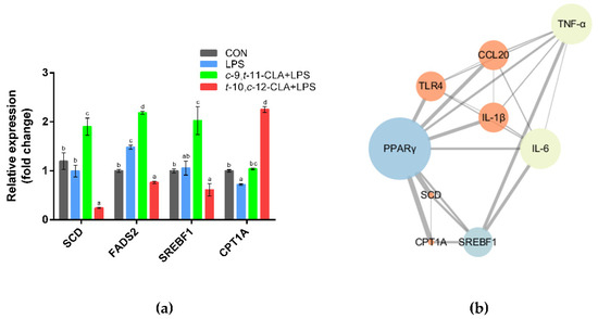 Effects of pretreatment with different conjugated linoleic acid (CLA) isomers on the expression of genes related to lipid metabolism in ruminal epithelial cells (RECs). (a) Gene expression levels of SCD, FADS2, SREBF1 and CPT1A among different groups. a–d Bars that share different superscript letters are significantly different from each other (p < 0.05). (b) Protein–protein interaction (PPI) network of the differentially expressed genes (DEGs) involved in lipid metabolism and inflammatory responses. The node size and color represent the number of degrees and the clustering coefficient (blue indicates low values, red indicates high values), respectively, and the edge represents the interaction (the thicker edge indicates the lower betweenness).