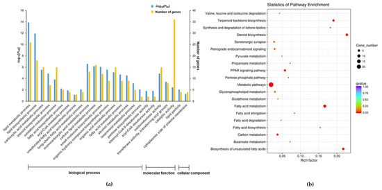 The qPCR results indicated that pretreatment with c-9,t-11- and t-10,c-12-CLA both significantly upregulated the expression level of carnitine palmitoyltransferase 1A (CPT1A) in RECs upon LPS stimulation (p < 0.05) (Figure 7a). Although t-10,c-12-CLA significantly downregulated the expression of the genes encoding stearoyl-CoA desaturase (SCD) and fatty acid desaturase 2 (FADS2), c-9,t-11-CLA significantly upregulated the expression of the genes encoding SCD, FADS2 and sterol regulatory element binding transcription factor 1 (SREBF1) compared with the LPS group (p < 0.05) (Figure 7a). KEGG and GO analyses further indicated that the DEGs that were downregulated in the t-10,c-12-CLA+LPS group, compared to the LPS group, were significantly enriched in the pathways of fatty acid metabolism and biosynthesis of unsaturated fatty acids (Figure 5), whereas the DEGs that were upregulated in the c-9,t-11-CLA+LPS group were significantly enriched in the signals of molecular functions of stearoyl-CoA 9-desaturase and acyl-CoA desaturase activity (Figure 8a), as well as the pathways of fatty acid metabolism and the biosynthesis of unsaturated fatty acids (Figure 8b). PPI analysis of the DEGs regarding adipocytokine and inflammatory cytokine signals further identified SREBF1, PPARγ, TLR4, IL-6, TNF-α, IL-1β and CCL20 as hub genes (degree > 5), which also showed close interactions (Figure 7b).