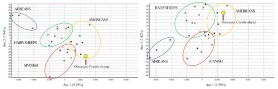 For the analysis of genetic differentiation of the Oaxacan Creole sheep, it was compared with 27 breeds (Table 1), including some native Spanish, American Creole, African, and breeds common in México. For this purpose, we used the database of the Laboratory of Applied Molecular Genetics of Animal Breeding Consulting S.L. and of the Biovis Consortium (https://biovis.jimdo.com/breeds/ accessed on 21 October 2019). The intellectual property of the data of these breeds belongs to investigators of the network CONBIAND (https://biovis.jimdo.com/investigadores/ accessed on 21 October 2019). The F statistics of Wright [] were calculated for the coefficient of consanguinity (FIT), as well as the coefficient of genetic differentiation (FST) and the endogamy coefficient (FIS), and a Factorial Analysis of Correspondence was also made using the program GENETIX v 4.05 []. The Genetic Distance was calculated (DA) [] in the program POPULATIONS []. With the values of distance obtained, a phylogenic network of union of neighbors using the program SPLITSTREE [] was made to represent the distance among the breeds.