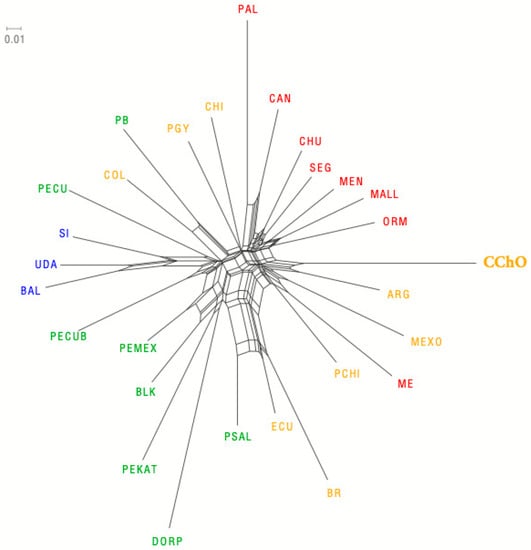 Representation of the DA genetic distances in a neighbor-net between the Oaxacan Creole and 27 other sheep populations. In yellow, Creole breeds; in red, Spanish breeds; in blue, African breeds; in green, Hairy sheep. ARG: Argentine Creole, BAL: Balami, BLK: Blackbelly, BR: Brazil Creole, CAN: Canarian, CChO: Creole Chocholteca Oaxaca, CHI: Chiapas Creole, CHU: Churra, COL: Colombian Creole, DORP: Dorper, ECU: Ecuador Creole, MALL: Mallorquina, ME: Merino Español, MEN: Menorquina, MEXO: México, ORM: Roja Mallorquina, PAL: Palmera, PB: Pelibuey, PCHI: Merino Chileno, PECU: Pelibuey Ecuador, PECUB: Pelibuey Cuban, PGY: Creole Paraguay, PEKAT: Katahdin, PEMEX: Pelibuey Mexicano, PSAL: Pelibuey El Salvador, UDA: UDA.