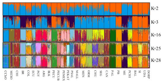 Genetic structure of the 28 sheep populations analyzed. The figure shows the graphic representation of the populational grouping when it is compared with a different number of populations (K): K = 2, K = 3, K = 16, K = 25 (optimum) and K = 28. In the X-axis the populations occupied are numbered (Table 1), where the 1 is the Oaxacan Creole.