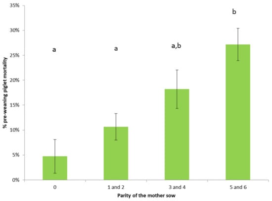 Percentage mortality prior to weaning in sows of various parities. (a, b) indicate a significant difference at p < 0.01.