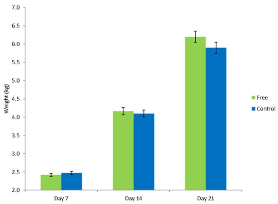 There tended to be an interaction between treatment and day on pre-weaning live-weight (p = 0.08), with piglets from the free treatment heavier, although not significantly, on day 14 and day 21 after birth (Figure 3).