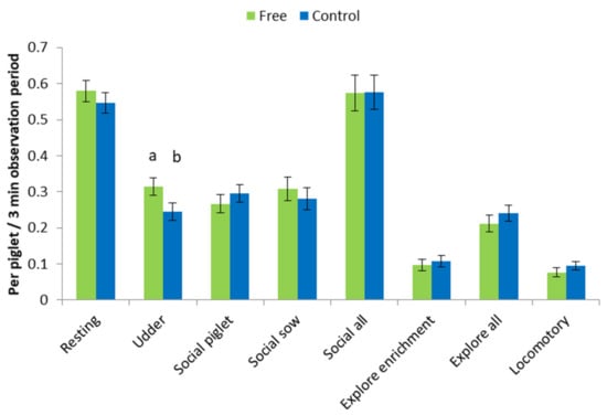 In the free treatment, piglets were observed more often at the udder (p < 0.05; Figure 4) than those in the control group. Social, exploratory and locomotory play behaviours were not affected by treatment.