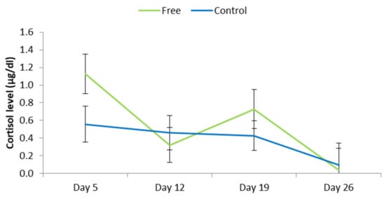 Overall, there was no effect of treatment on faecal cortisol concentrations (free = 0.553 ± 0.159 µg/dL, control = 0.386 ± 0.148 µg/dL; p = 0.14). Nevertheless, there was an interaction between sampling day and treatment (p < 0.01; Figure 5). On the first sampling day, which corresponded to approximately 1 day after the crate was opened in the free treatment, piglets in free tended to have higher faecal cortisol levels than those from control (p = 0.07).