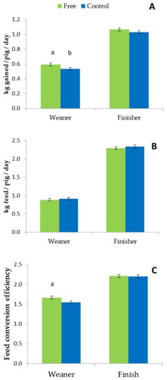 (A) Average daily gain (ADG), (B) Average daily feed intake (ADFI) and (C) Feed conversion efficiency (FCE) for pigs from free and control treatments post-weaning. Free and control treatments during lactation. Free pigs were managed in pens where the sow was free to turn around from day 4 of lactation to weaning (free) and control were in conventional farrowing crates. a, b indicates a significant difference at p < 0.05.