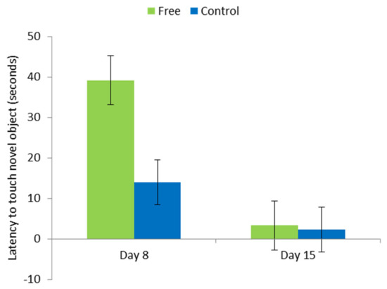 Latency for the first pig to touch the novel object at 8 and 15 days post weaning. There was an effect of treatment (p < 0.05), and an interaction between treatment and examination time (p < 0.05). ‘Free’ indicates pigs which had been reared in pens where the sow was free to turn around from day 4 of lactation to weaning and ‘control’ conventional farrowing crates (Crate).