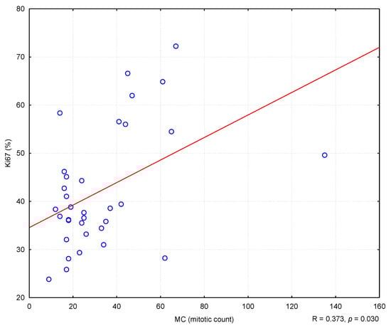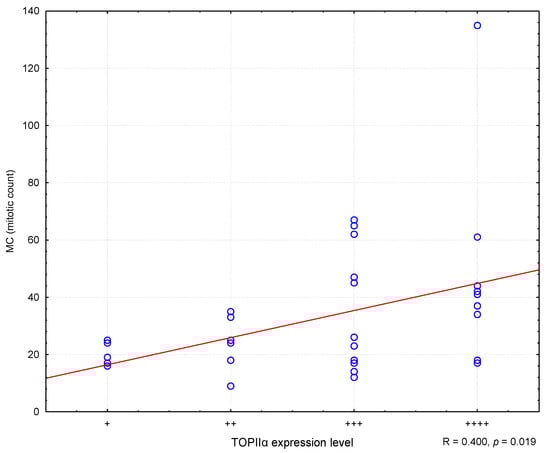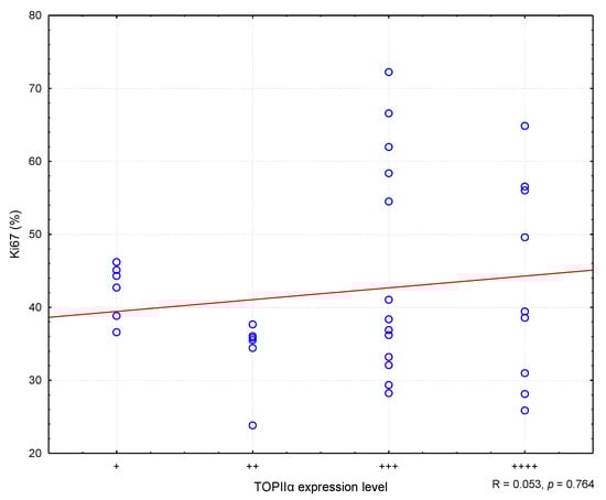 In the conducted study, it was found that higher MC values corresponded to higher Ki67 antigen index values, and the correlation was statistically significant (R = 0.373; p = 0.030) (Figure 2). Similarly, higher levels of TOPIIα expression corresponded to higher MC values (R = 0.400; p = 0.019) (Figure 3). However, no statistically significant correlation was found between the level of TOPIIα expression and the Ki67 values (R = 0.053; p = 0.764) (Figure 4).