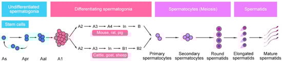 The stem cell pool in testis is maintained and expanded through self-renewing divisions of SSCs and a series of mitotic divisions that facilitate the transition of SSCs to spermatogonia with different states. The spermatogenic process is generally similar in almost all mammals [46]. In the beginning, spermatogonia is divided into type A, intermediate (In), and type B spermatogonia, which are simply categorized by their amount of heterochromatin. Thereafter, more generations of spermatogonia with different differentiating stages (especially among type A spermatogonia) were discovered to further categorize them [47]. The spermatogonial population consists of undifferentiated and differentiating spermatogonia. The classes of undifferentiated spermatogonial populations is consistent in most mammal species, consisting of type Asingle spermatogonia (As), Apaired spermatogonia (Apr) (chains of 2 cells connected by an intercellular bridge), and Aaligned spermatogonia (Aal) (chains of 4, 8, and often 16 cells) generated by successive mitotic divisions. The least differentiated As spermatogonia are generally considered to be SSCs, while Apr are considered to be progenitor spermatogonia [47]. Broadly speaking, the germ cell populations that can regenerate the spermatogenic lineage following SSCT can all be considered SSCs, which often include gonocytes and partial undifferentiated spermatogonia. Almost all Aal cells transition without cell division to A1 differentiating spermatogonia [48,49], and then undergo 2–6 generations of differentiating spermatogonia to produce primary spermatocytes. In mice and pigs, the differentiating spermatogonial population is formed by A1, A2, A3, A4, In, and B spermatogonia [46]. In cattle and sheep, the differentiating spermatogonial population contains A1, A2, A3, In, B1, and B2 spermatogonia [46]. Afterward, spermatocytes enter meiosis to generate haploid spermatids, which finally develop to spermatozoa via cytodifferentiation (Figure 1).