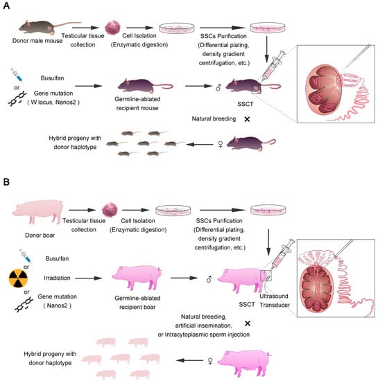 Spermatogonial stem cell transplantation (SSCT) procedure in mouse models and livestock species. Schematic showing the typical steps involved to produce donor SSC-derived progeny through SSCT in mice (A) and pigs (B). Testicular cells are isolated from the testis of donor male animals by collagenase digestion. Afterward, spermatogonia are enriched through multiple cycles of differential plating. The purity of spermatogonia can be further enhanced through discontinuous Percoll density gradient centrifugation. The enriched spermatogonia are adjusted to suitable concentration for transplantation. To ensure an effective SSCT, ablation of endogenous Spermatogonial stem cells (SSCs) of recipient males is required. In this regard, busulfan treatment is generally effective for mouse SSC ablation, but remains inefficient in large animals. Other ablative methods, such as irradiation of testis, also has limited effect on endogenous SSC removal to support an effective SSCT. Recently developed genetic modification technology can create genetically sterile animals with a complete SSC ablation but preserving intact testicular supporting cell structure, therefore offering an alternative approach to generate SSC-ablated recipient males. In mice, transplanted cells are usually injected through efferent tubules, whereas rete testis is the easy route for injection of spermatogonia in some large animals. Successful SSCT can re-establish spermatogenesis of recipient animals to generate donor-derived sperm, which can fertilize eggs to produce offspring harboring donor gene alleles.