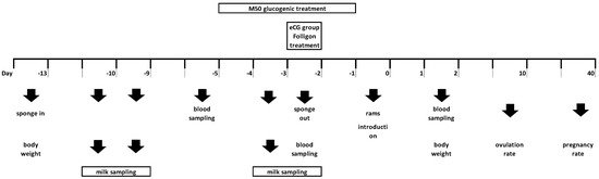 The experimental protocol is depicted in Figure 1, where day 0 (D0) is the day of ram introduction. In brief, oestrus synchronization was induced in all the animals with the insertion (D−13) of one intravaginal progestagen-impregnated sponge (45 mg fluorogestone acetate, FGA, Chronogest; Intervet International, Boxmeer, the Netherlands) which remained in situ for 11 d. On the day of sponge withdrawal (D−2), GON ewes received an intramuscular injection of 200 IU of eCG (Folligon, MSD Animal Health Srl, Segrate, Italy). From D0 to D2, all ewes were joined with fertile rams (n = 10) fitted with crayon markers.