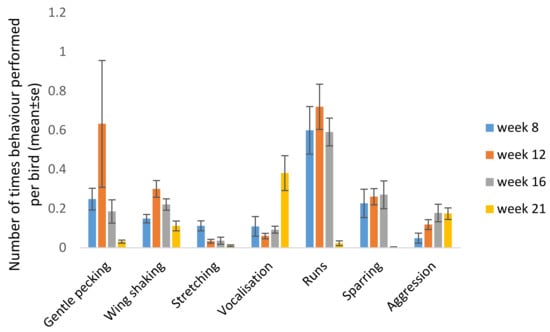 Age had an effect on the frequency of expression of the behaviours gentle pecking (F3,27 = 3.20, p = 0.039), wing shaking (F3,27 = 5.19, p = 0.006) stretching (F3,27 = 6.01, p = 0.003), vocalisation (F3,27 = 7.9; p = 0.0007), runs (F3,27 = 11.51, p < 0.0001) and sparring (F3,27 = 4.721, p = 0.009). There was no difference between ages for the behaviour aggression (F3,27 = 1.85, p = 0.16). Severe pecking was only observed 13 times over all observations (5, 2 and 6 times in C, D and F, respectively) and was therefore excluded from the statistical analyses.