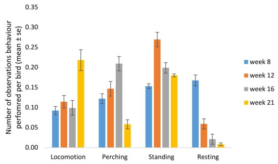 Locomotion: Locomotion occurred more often in week 21 compared with week 8 (p = 0.0002), week 12 (p = 0.0022) and week 16 (p = 0.0007), whereas perching increased from week 8 to 16 (p = 0.038) but then decreased in week 21 (week 16 vs. 21 p = 0.005). Standing occurred more often in week 12 compared with week 8 (p = 0.0077). Resting decreased over age and differed between most weeks, and was less frequent in week 21 compared with the other weeks (week 8 vs. 12 p = 0.0015, week 8 vs. 16 p = 0.00010, week 8 vs. 21 p = 0.0004, week 12 vs. 16 p = 0.046, week 12 vs. 21 p = 0.021) (Figure 3).