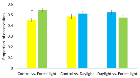 Results from the preference tests showed a tendency for an overall difference in preference for the different lights (Glimmix; F2,54 = 2.95, p = 0.061). In general, the birds tended to spend more time in Daylight (p = 0.071) compared with Control light. In pairwise comparisons for each of the three different light combinations, significantly more birds were observed in the section with Forest light when the other section had Control light (F1.22 = 13.32, p = 0.001) (Figure 4), but there were no significant differences between the other light combinations.