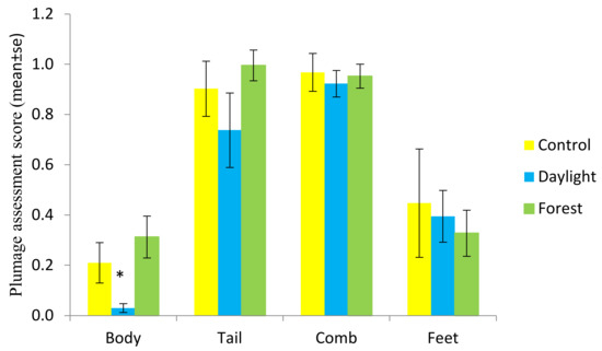 There was a significant difference between treatments for body score (GLM; F2,9 = 4.47, p = 0.044), with Daylight birds having a better feather score, i.e., lower damage, than Forest light birds (Tukey test p = 0.039) (Figure 5).