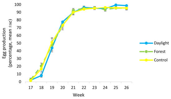 There was no difference between light treatments in overall egg production from start of lay at 17 weeks of age until the experiment finished at 27 weeks of age (GLM; F2,9 = 0.39, p = 0.69). There was a tendency for hens from different light treatments to differ in percentage of lay at 18 weeks of age (GLM; F2,9 = 3.40, p = 0.079), with the Daylight treatment having a lower percentage of lay compared with the Forest light treatment (p = 0.08, Tukey test) (Figure 6).