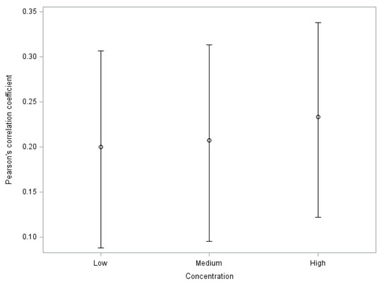 Correlations observed for low (r = 0.20, p < 0.001), medium (r = 0.20, p < 0.001), and high (r = 0.22, p < 0.001) concentrations were similar among the three groups, where a weak but statistically significant correlation was observed (Figure 1). These results show a robust correlation for the three groups.