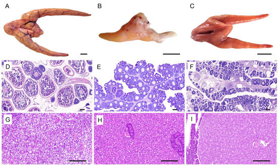 The livers from the three groups exhibited round hepatocytes with a basophilic nucleus in the center, and the liver plate had clear structure and regular arrangement. The only difference was that the livers from the infertile and the negative control groups exhibited less vacuoles compared to the fertile group (Figure 1G–I).