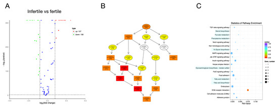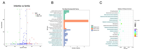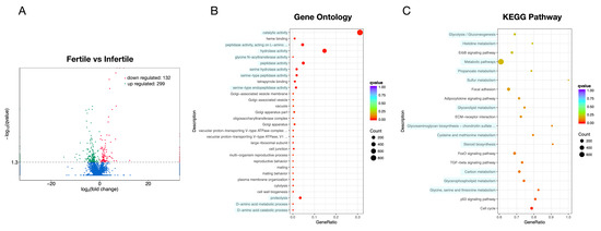 A total of 2076 significantly DEGs including 1920 up-regulated and 156 down-regulated (infertile vs. fertile) were observed (Figure 2A). Functional analysis showed that the significantly different mRNAs were mainly enriched in metabolism, immunity, signal transduction, and steroid biosynthesis pathway (Figure 2B,C).