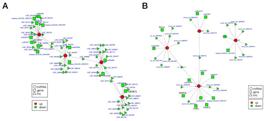 Competing endogenous RNA (ceRNA) network related to metabolism, immunity, and signal transduction between infertile and fertile group in Paralichthys olivaceus. (A) lncRNA-miRNA-gene ceRNA networks. (B) circRNAs-miRNA-gene ceRNA networks. Rectangle, ellipse, and triangle indicate mRNA, miRNA, and lncRNA/circRNA, respectively. Green and red indicate down-regulation and up-regulation, respectively.