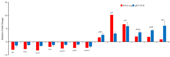 To validate the results obtained by RNA-seq, 13 DEGs (fas, acac, acod, lcat, pa21b, psb4, msmo1, g6pc, zp4, cate, dbloh, pnph, and ibp1) were randomly selected for qRT-PCR confirmatory assays. One product was detected from each primer set and assessed by melting curve analysis. Fold changes of each gene were compared with the RNA-Seq profiles. qRT-PCR trends were consistent with RNA-Seq (Figure 7), indicating the reliability of RNA-Seq analysis.