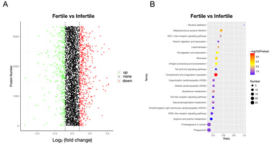 Volcano plot and pathway analysis of differentially expressed proteins (DEPs) between infertile and fertile group in Paralichthys olivaceus. (A) Volcano plot of DEPs. The red spots, green spots, and black spots separately represent down-regulated, up-regulated, and undifferentiated proteins. (B) Top 20 significantly changed pathways associated with DEPs.