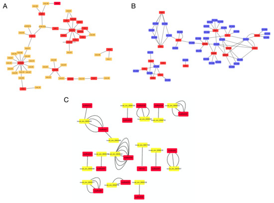 miRNA/lncRNA/circRNA and cor-DEGs-DEPs genes relationship network between infertile and fertile group in Paralichthys olivaceus. (A) miRNA and cor-DEGs-DEPs genes relationship network. (B) lncRNA and cor-DEGs-DEPs genes relationship network. (C) circRNA and cor-DEGs-DEPs genes relationship network.