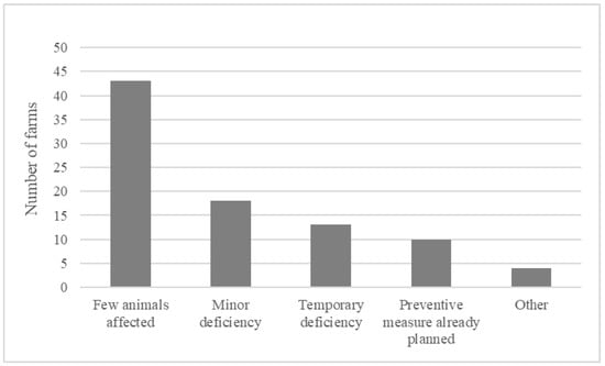 Reasons stated by animal welfare inspectors for categorizing 56 farms as compliant with Swedish animal welfare legislation on animal cleanliness, despite dirty animals being observed during inspections. One or several reasons could be given.