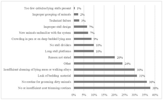According to the inspectors and farmers, ‘insufficient coat trimming routines’ (n = 69, 38%) and ‘absence of routines for grooming dirty animals’ (n = 66, 36%), followed by ‘lack of bedding material’ (n = 52, 31%) and ‘insufficient cleaning of lying areas or walking alleys’ (n = 55, 30%) were the most common reasons for ‘not clean enough animals’ being found during inspections (Figure 3). In most cases, several likely reasons for insufficient cleanliness were stated.