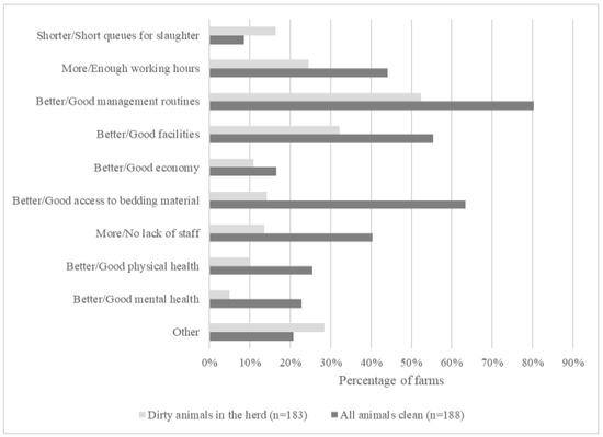 Better weather conditions were most often mentioned (n = 10) when the option ‘other’ was ticked for farms with dirty animals in the herd. Keeping a low or not too high stocking density was the most commonly stated ‘other’ factor in success for farms with clean animals (n = 15).