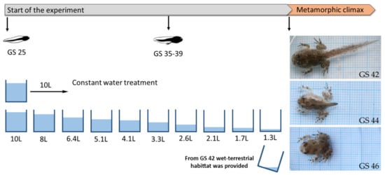 Global climate change and subsequent processes are considered responsible for decreasing populations of various wild species [1,2]. Amphibian species are recognized as a particularly globally threatened vertebrate taxa; we are witnessing worldwide threats faced by batrachofauna from habitat modification, environmental pollution, global warming, emerging pathogens and invasive species, all of which present a dramatic challenge for both science and society [3]. Due to their ectothermic nature, semipermeable skin and complex life cycles, amphibians are strongly dependent on specific temperature ranges, moisture, and precipitation—factors which are fundamentally affected by the process of global warming [3,4]. There is evidence that climate change, especially temperature-related change, can alter reproductive phenology, body condition and sensitivity to disease in amphibians [5]. The shortening of wetland hydroperiods has resulted in an increased frequency of reproductive failure for many amphibian species that use temporary or even ephemeral aquatic habitats for reproduction [5,6]. In particular, pond drying is affecting the development of anuran larvae [7]. It can lead to changes in water temperature, larval densities, food availability and host-pathogen or predator-prey interactions—all of which are directly linked to survival [8]. Larvae exposed to desiccation pressure need to make an ontogenetic niche shift before a pond dries up [6]. This shift, however, carries trade-offs that may have short- and long-term costs [9]. Costs could be seen in various morphological and physiological traits, e.g., reduced size at metamorphosis, leading to smaller maturation size, lower fecundity, reduction of hindlimb length, accelerated development, higher metabolic rates and alterations in oxidative metabolism and the immune system [6,7,8,10,11,12,13].