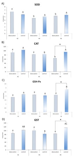 Antioxidant parameters (A)—superoxide dismutase (SOD); (B)—catalase (CAT); (C)—glutathione peroxidase (GSH-Px); and (D)—glutathione-S-transferase (GST)) in individuals from groups exposed to decreasing water availability (desiccation) and the control group, maintained at an unchanging water level (control) during metamorphic climax (Gosner stages 42, 44 and 46). * indicates significant differences between treatments (desiccation vs. control); different letters indicate significant differences between stages under each treatment (lower letters for desiccation, capital letters for the control).