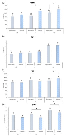 Oxidative stress parameters (A)—glutathione (GSH); (B)—glutathione reductase (GR); (C)—sulfhydryl (SH) groups; and (D)—lipid peroxide (LPO)) in individuals from groups exposed to decreasing water availability (desiccation) and a control group maintained at an unchanging water level during metamorphic climax (Gosner stages 42, 44 and 46).* indicates significant differences between treatments (desiccation vs. control); different letters indicate significant differences between stages under each treatment (lower letters for desiccation, capital letters for the control).