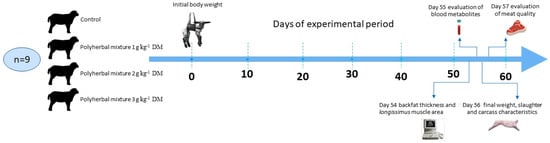 Completely randomized design and sampling times of lambs supplemented with a polyherbal mixture during the final fattening period; n = 9 indicate the number of animals sampled in each treatment; DM = dry matter.