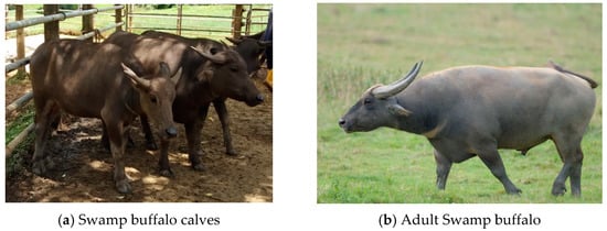 The Swamp buffaloes; (a): Swamp buffalo calves; (b): Adult Swamp buffalo.