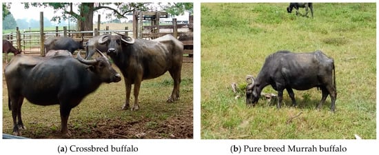 There are two types of domestic water buffaloes or Asian buffaloes, the Swamp and river buffaloes and Murrah buffaloes [1] as shown in Figure 1 and Figure 2. The Swamp buffaloes are found mainly in Southeast Asia and China and are kept mainly for meat and draft power in paddy fields and oil palm plantation. However, Murrah buffaloes are found mainly in South Asia, especially India and Pakistan, and are kept mainly for milk. In the field, river and Swamp buffaloes can be differentiated by their morphology and behavior. Swamp buffaloes are ash or dark grey with a white chevron line on the neck either one or two stripes and have socks, while the tip of the tail and the horns are swept backwards [2,3]. They prefer to wallow in the marshland and mud and have large feet with slow steady movement that make them well suited for paddy land preparation in swampy waterlogged rice fields [4]. On the other hand, Murrah buffaloes have a black body with tightly and forwardly curled horns. They prefer to wallow in clean water [2]. Generally, Swamp buffaloes are smaller than the Murrah buffaloes, while the crossbred buffaloes have the same morphology as Murrah. However, they are smaller than Murrah, but bigger than the Swamp buffaloes.