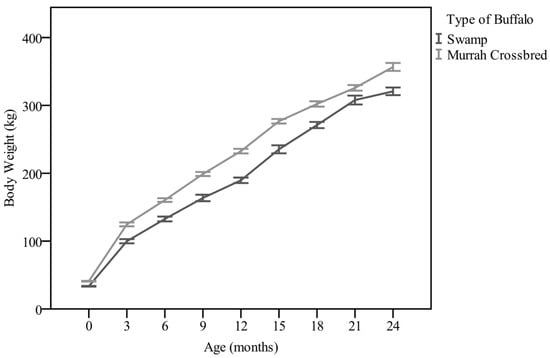 In general, the Murrah crossbred buffaloes had significantly heavier bodyweight than Swamp buffaloes from birth until 24 months old, which is in line with buffaloes in Indonesia [31], Thailand [22], and the Philippines [5,21,32]. The body weights of the buffalo calves can be affected by many factors, such as the feeding management [33,34,35], breeds of buffalo [5,25,27], and environmental factors [24,36,37].